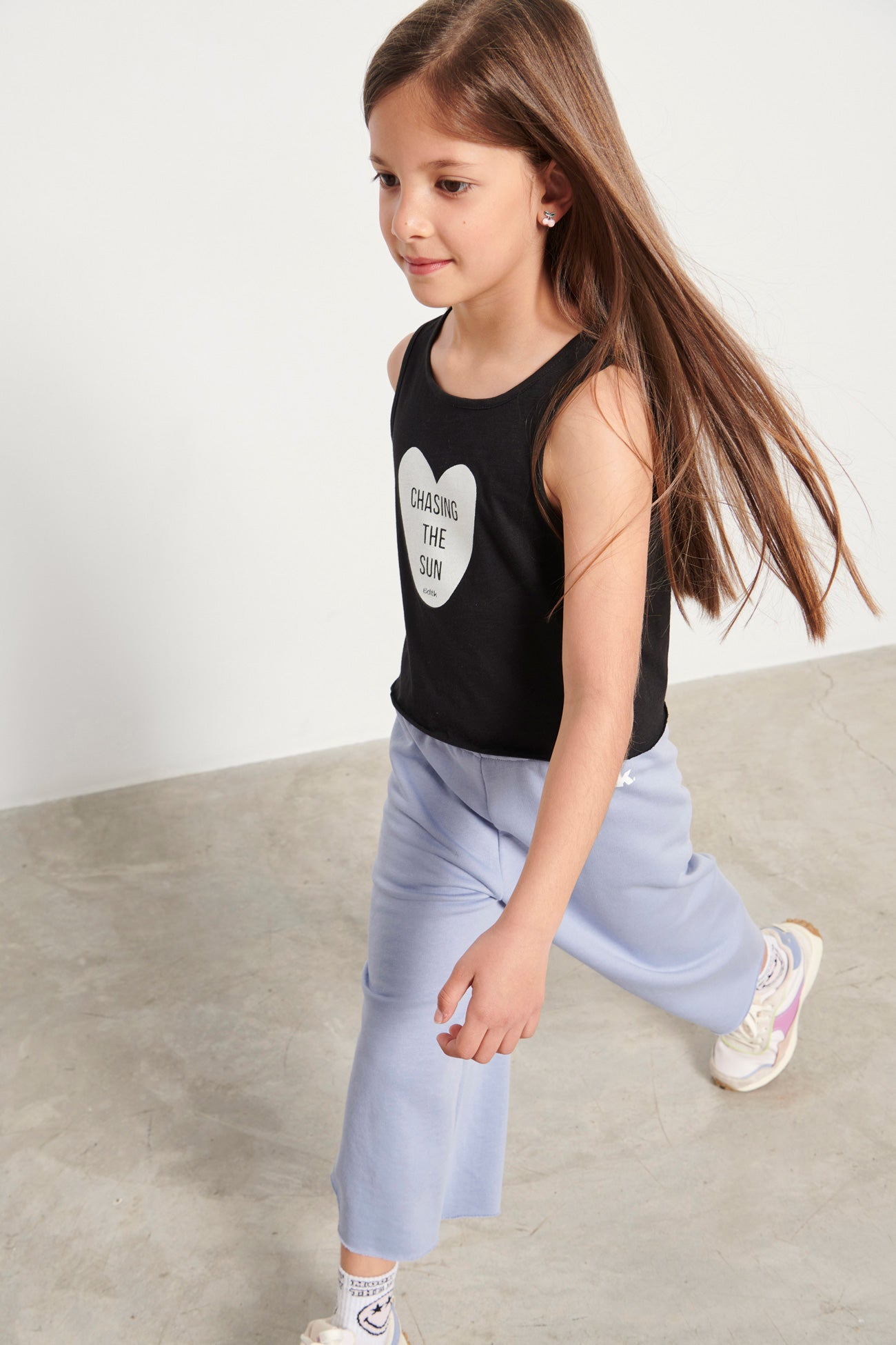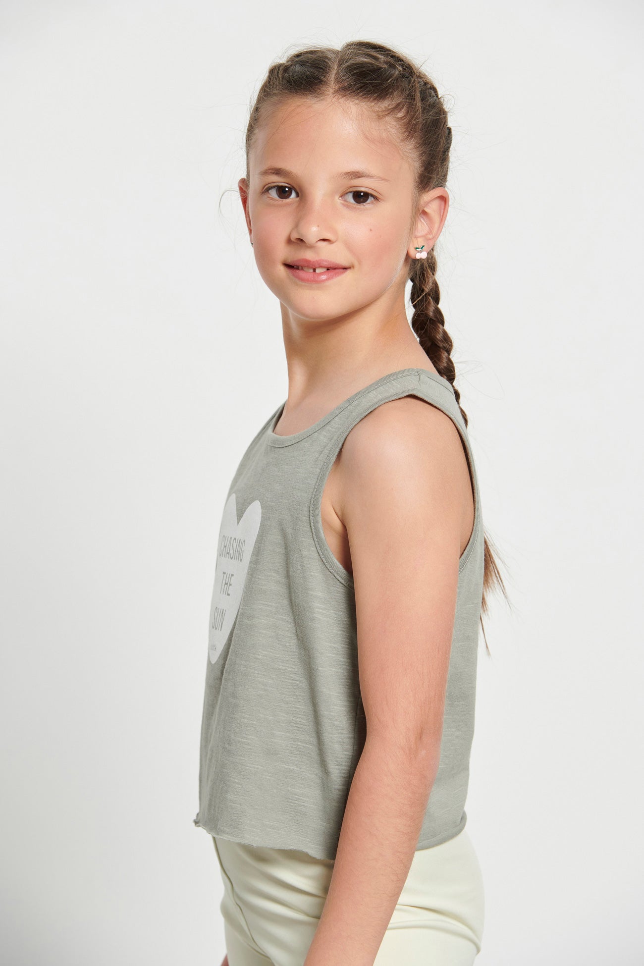 Kids’ sleeveless crop top for girls •With round neckline •Features a print at the front •Light fabric composed of flamma cotton •Soft and comfortable feel •Regular fit •Composition of 100% flamma cotton