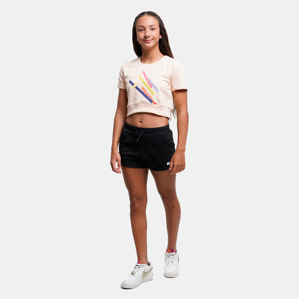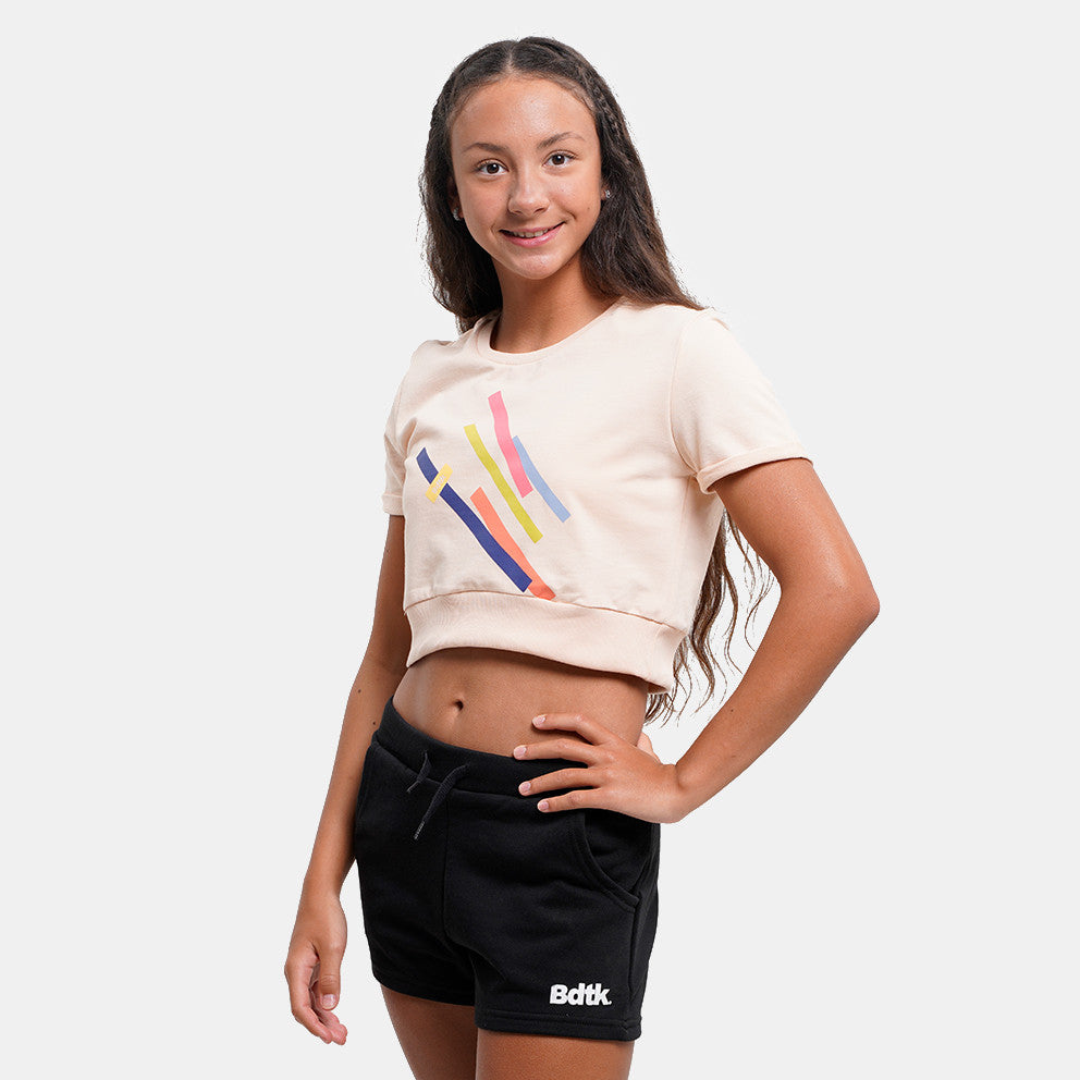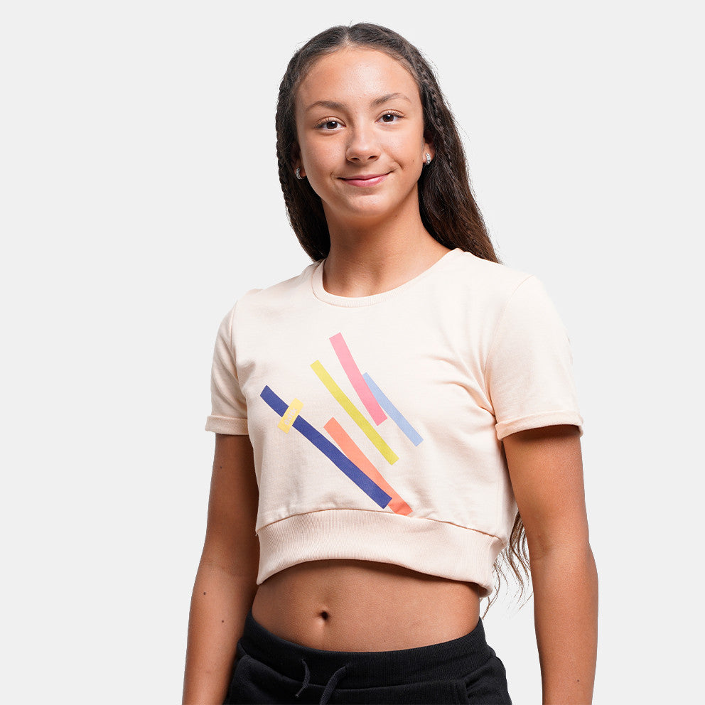Kids’ crop top for girls •Features a ribbed round neckline •Features a colorful print •Discreet cuffed sleeves •Ribbed elastic hem •Regular fit •Composition of 80% cotton and 20% polyester