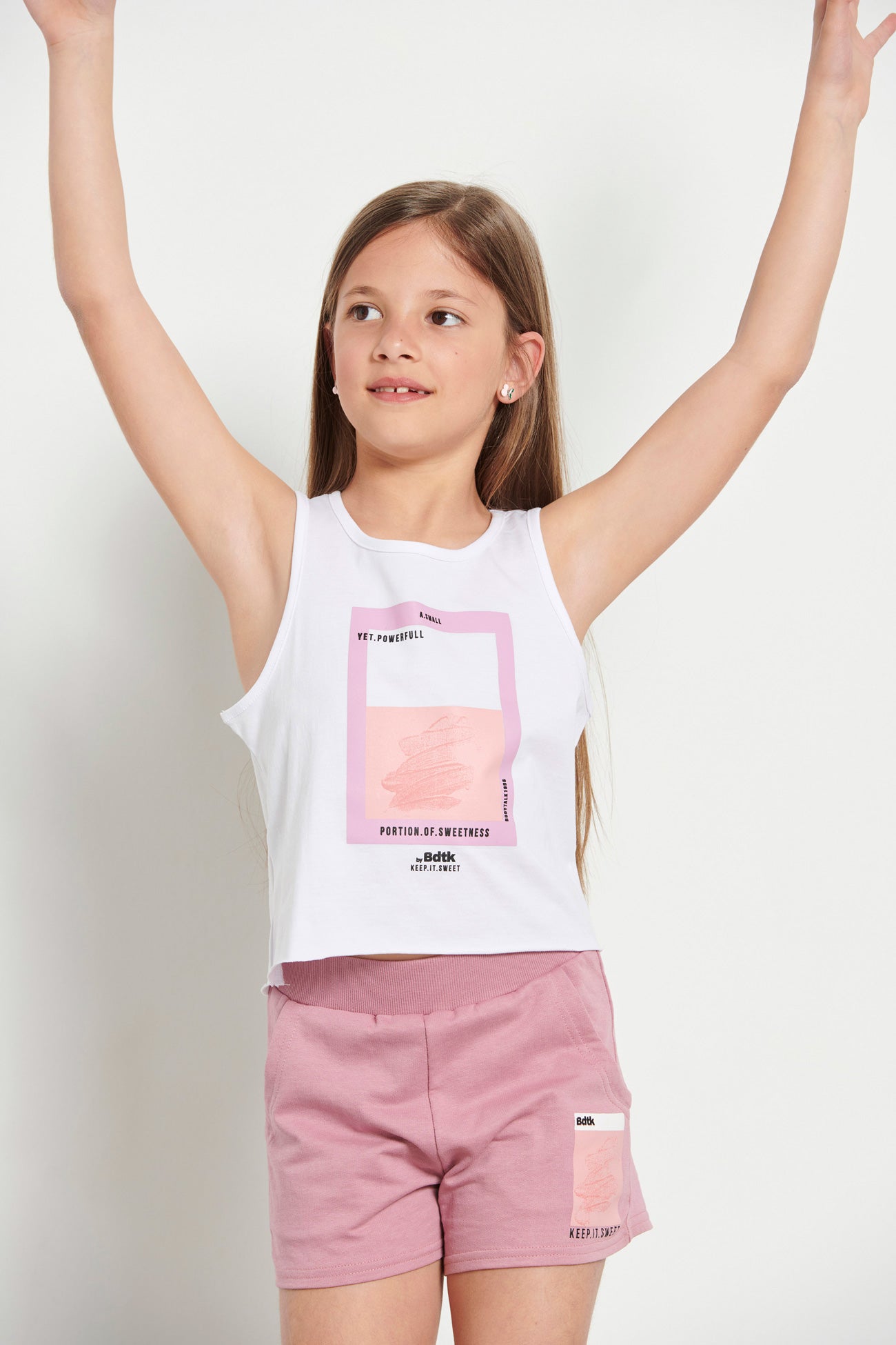 Kids’ shorts for girls •Ribbed elastic waistband •Two side pockets •Features a print •Regular fit •Composition of 80% cotton and 20% polyester