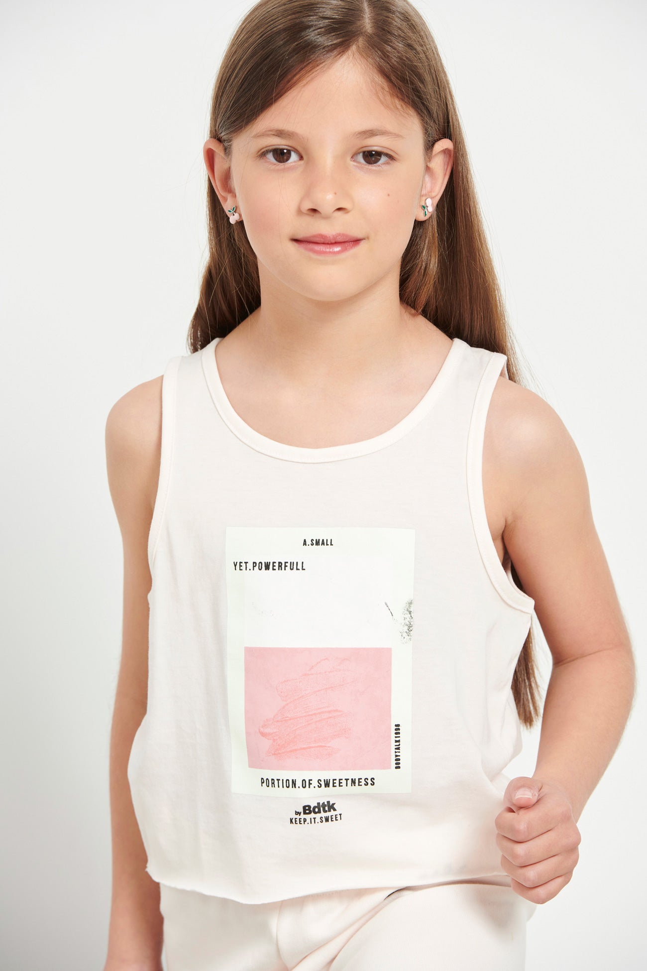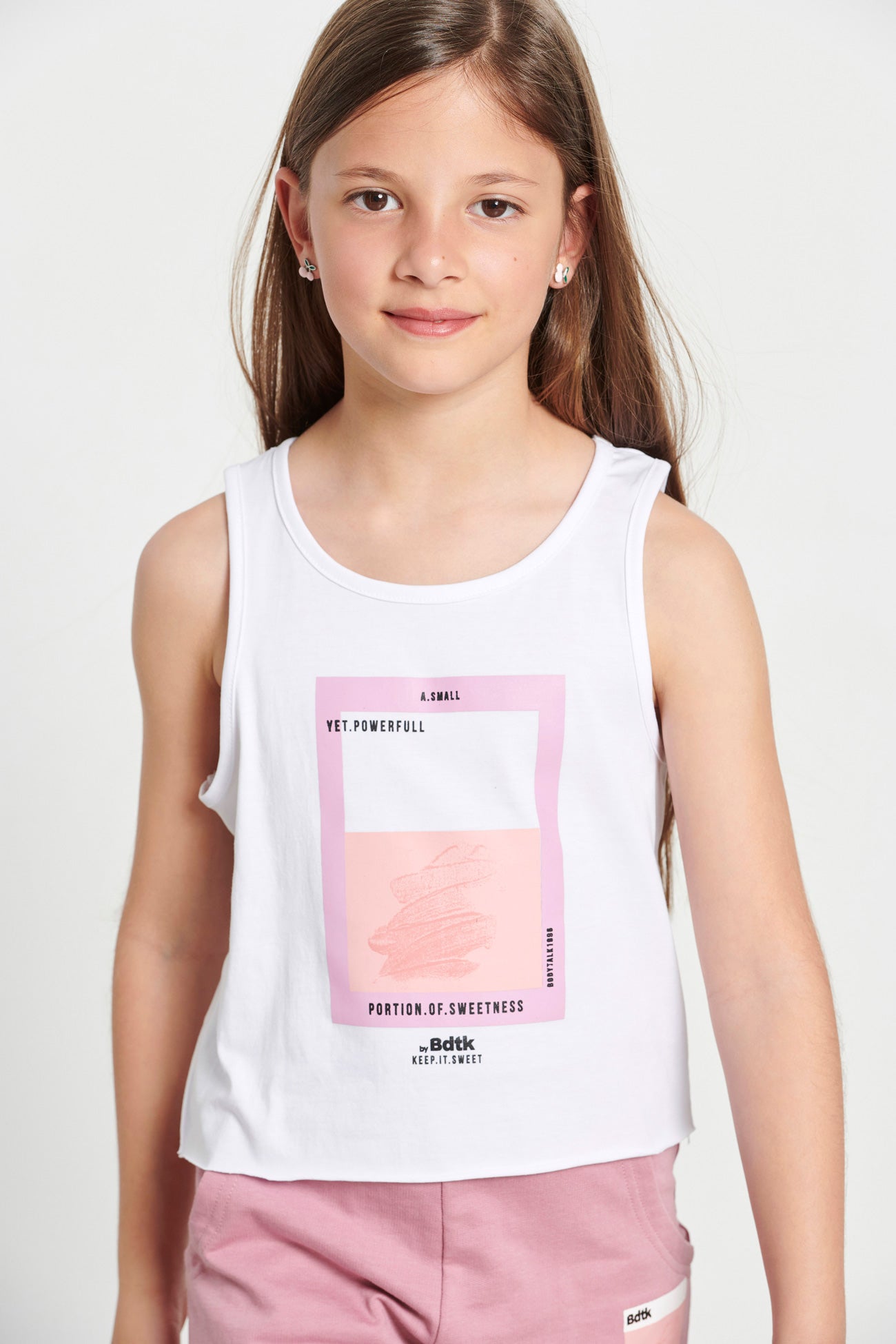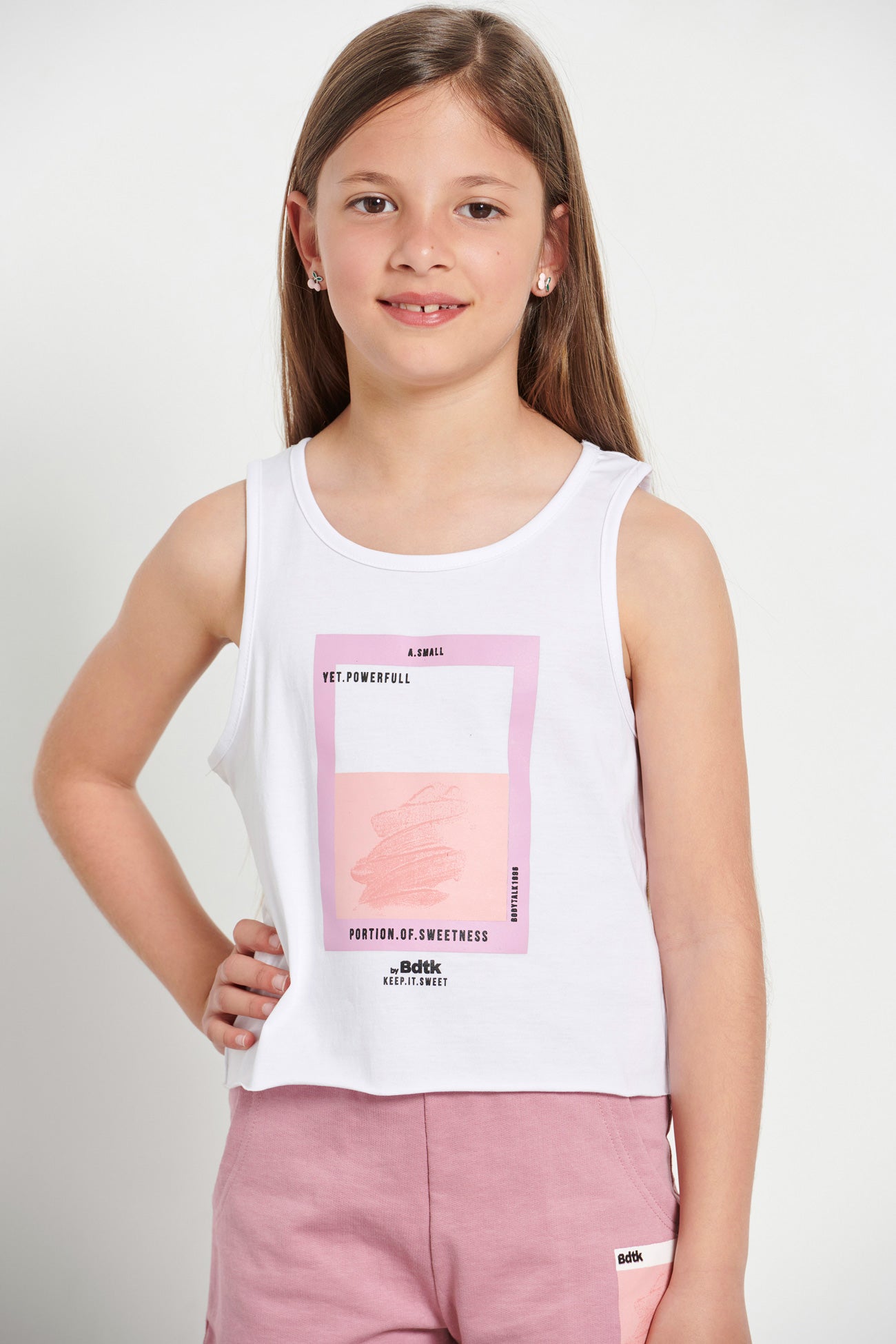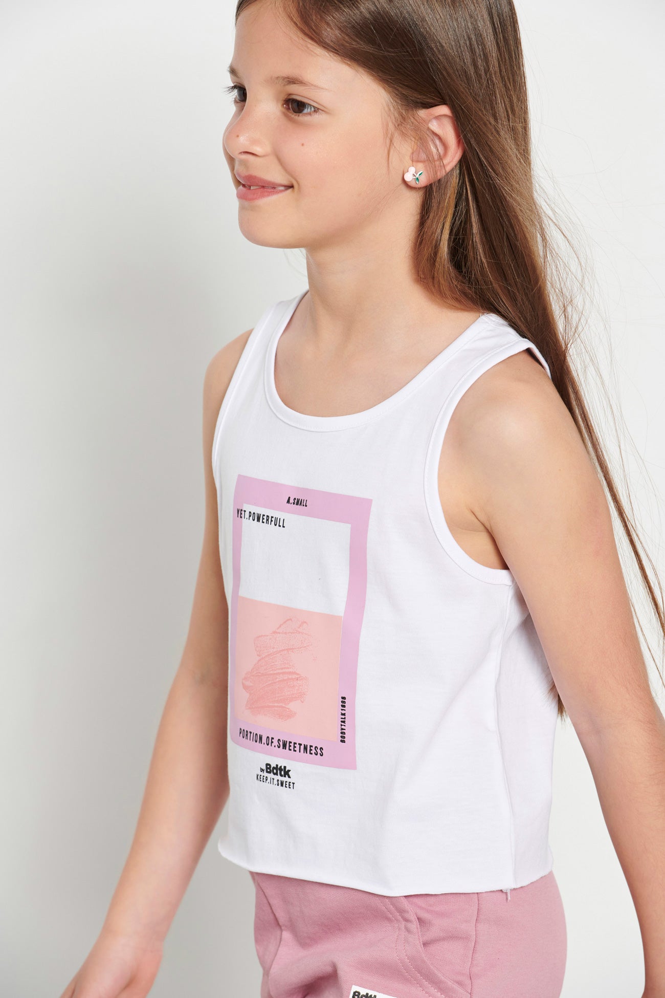 Kids’ sleeveless crop top for girls •With round neckline •Features a print at the front •Soft cotton fabric •Loose and comfortable fit •Regular fit •Composition of 100% cotton